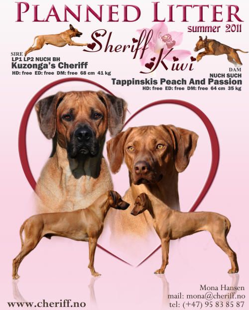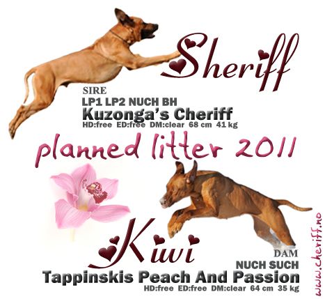 Mating has taken place 9th, 10th and 11th of May between Sheriff and Kiwi. Ultrasound will be done in the beginning of June, and hopefully puppies will be born around July 10th.